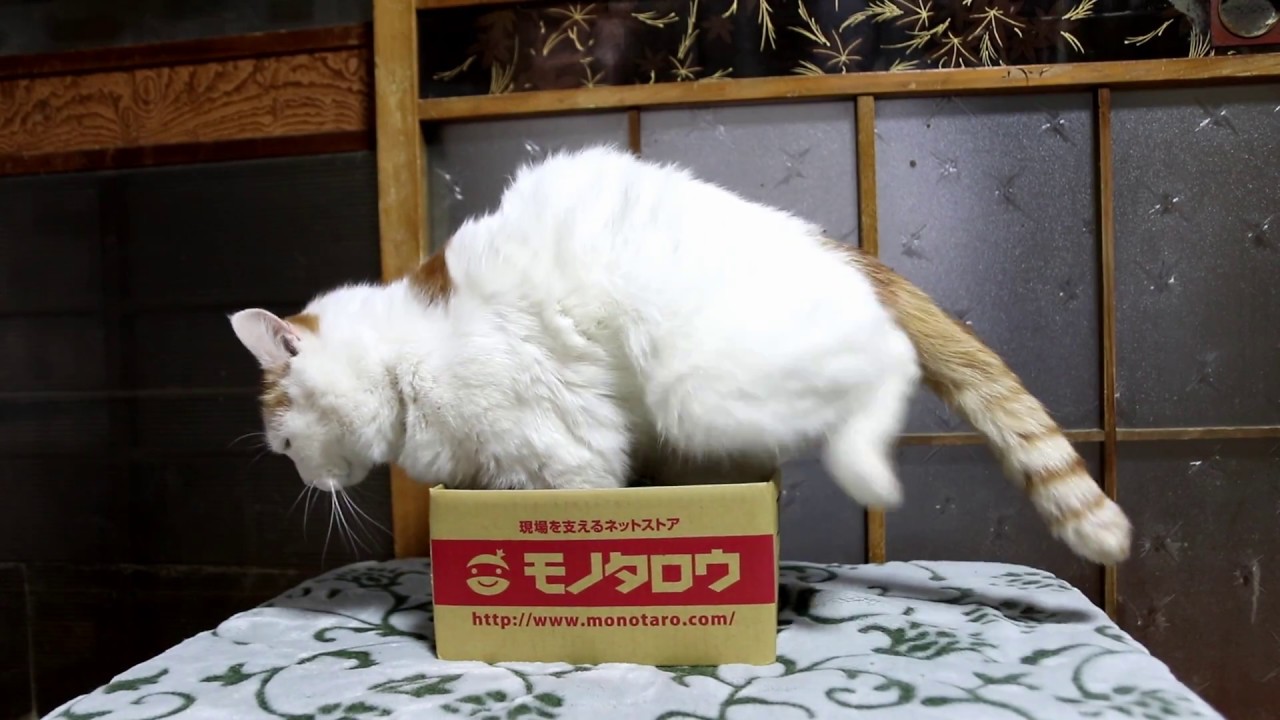 かご猫【小さい箱だニャ!】アマゾン(Amazon)のライバルのモノタロウの箱に入る猫!
