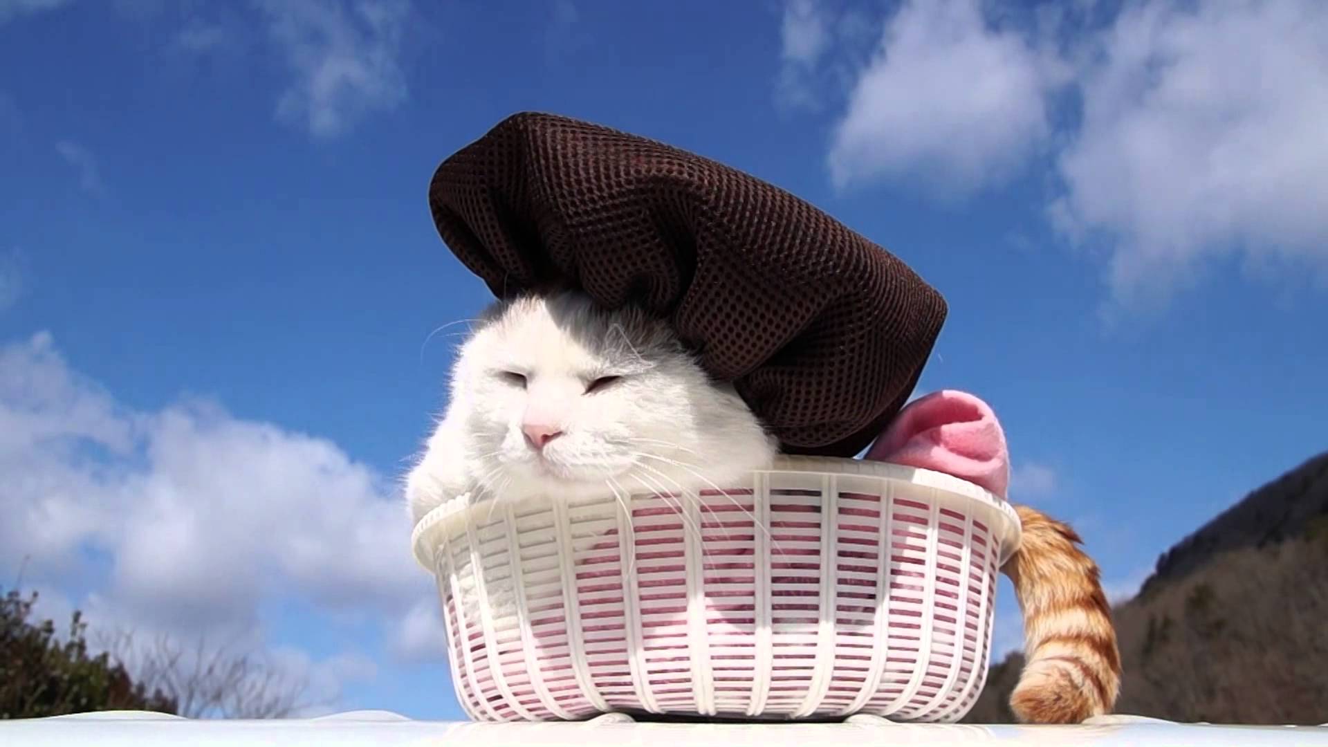 • かご猫~日本代表・麦わら帽子・スタッドレスタイヤ・黒い座椅子・猫と猫が頭・折り紙の兜・キャベツ・人参・耳付き帽子・お布団~