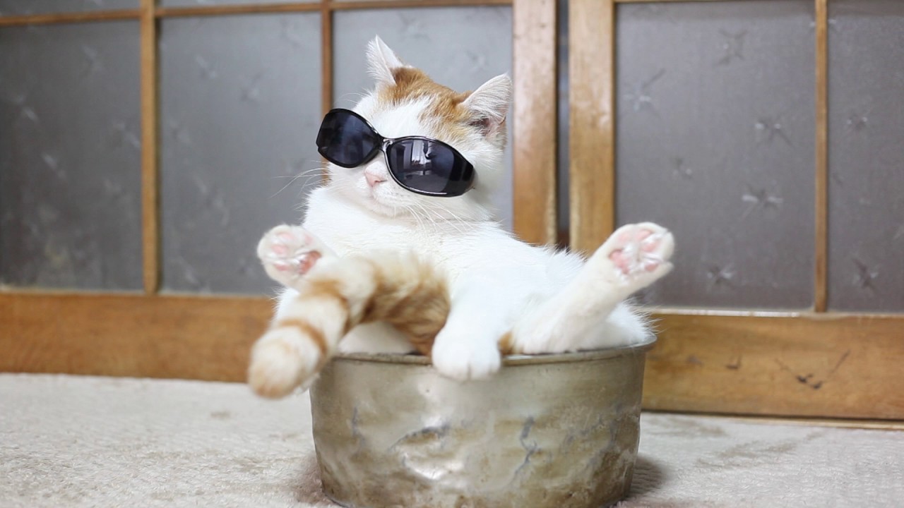かご猫【すっぽりだニャ!】サングラスをかけて鍋におさまる猫!