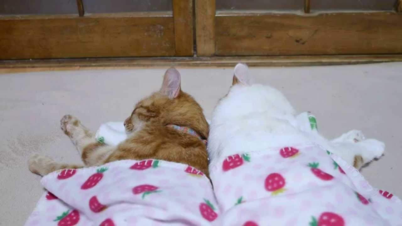 かご猫【ぐっすりだニャ!】苺柄の布団でお昼寝をする猫!