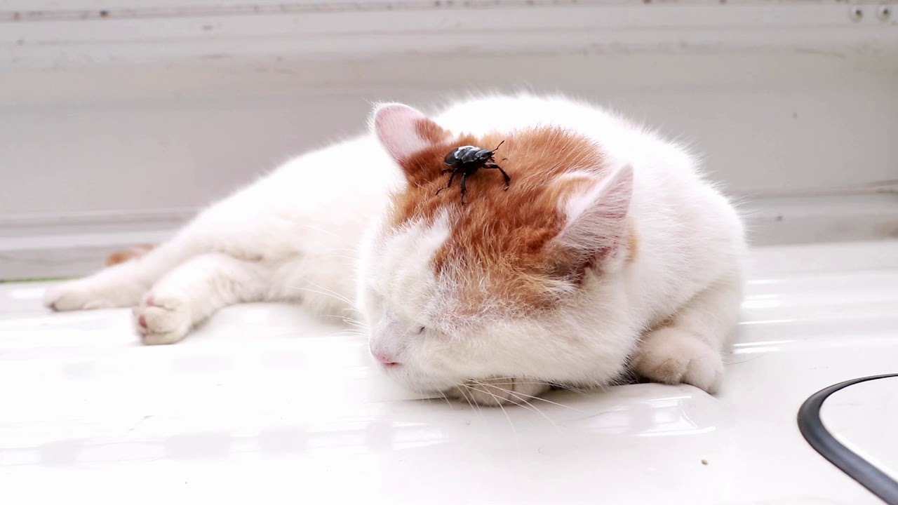 かご猫【夏はいつもこうだニャ!】クワガタムシが頭の上に乗った猫!