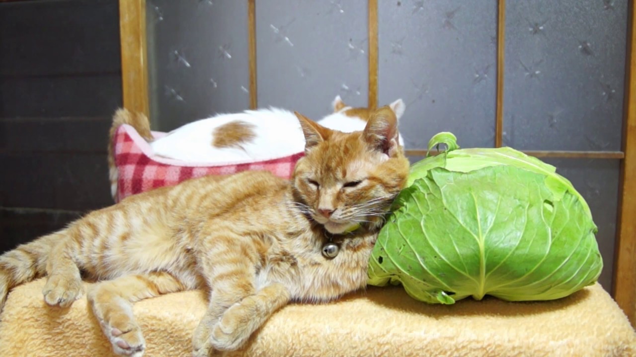 かご猫【これでいいニャ!】キャベツを枕にしてくつろぐ猫!