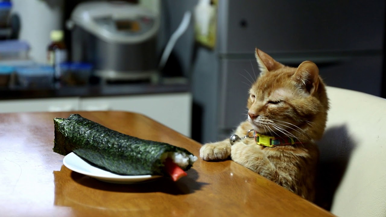 かご猫【これは何かニャ!】恵方巻をみつめる猫!