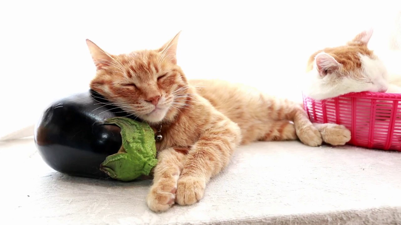 かご猫【大きな茄子だニャ!】ナスを枕にして寝る猫!