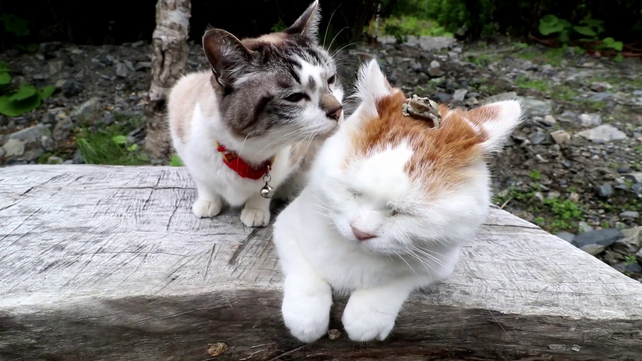 かご猫【何かいるニャ!】頭の上にカエルが乗った猫!