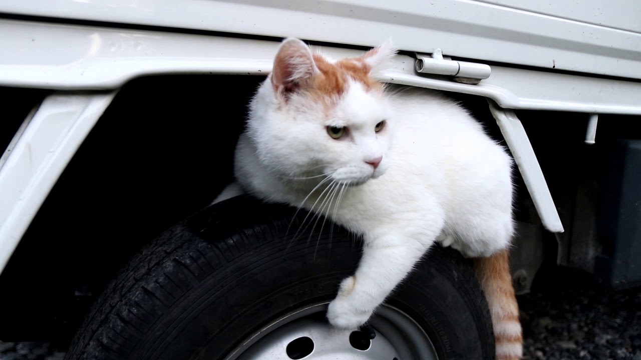かご猫【タイヤが大好きだニャ!】トラックのタイヤにスリスリする猫!