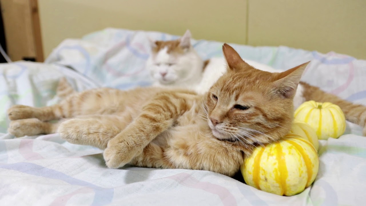 かご猫【自分サイズだニャ!】プッチーニかぼちゃ(西洋カボチャ)を枕にして寝る猫!